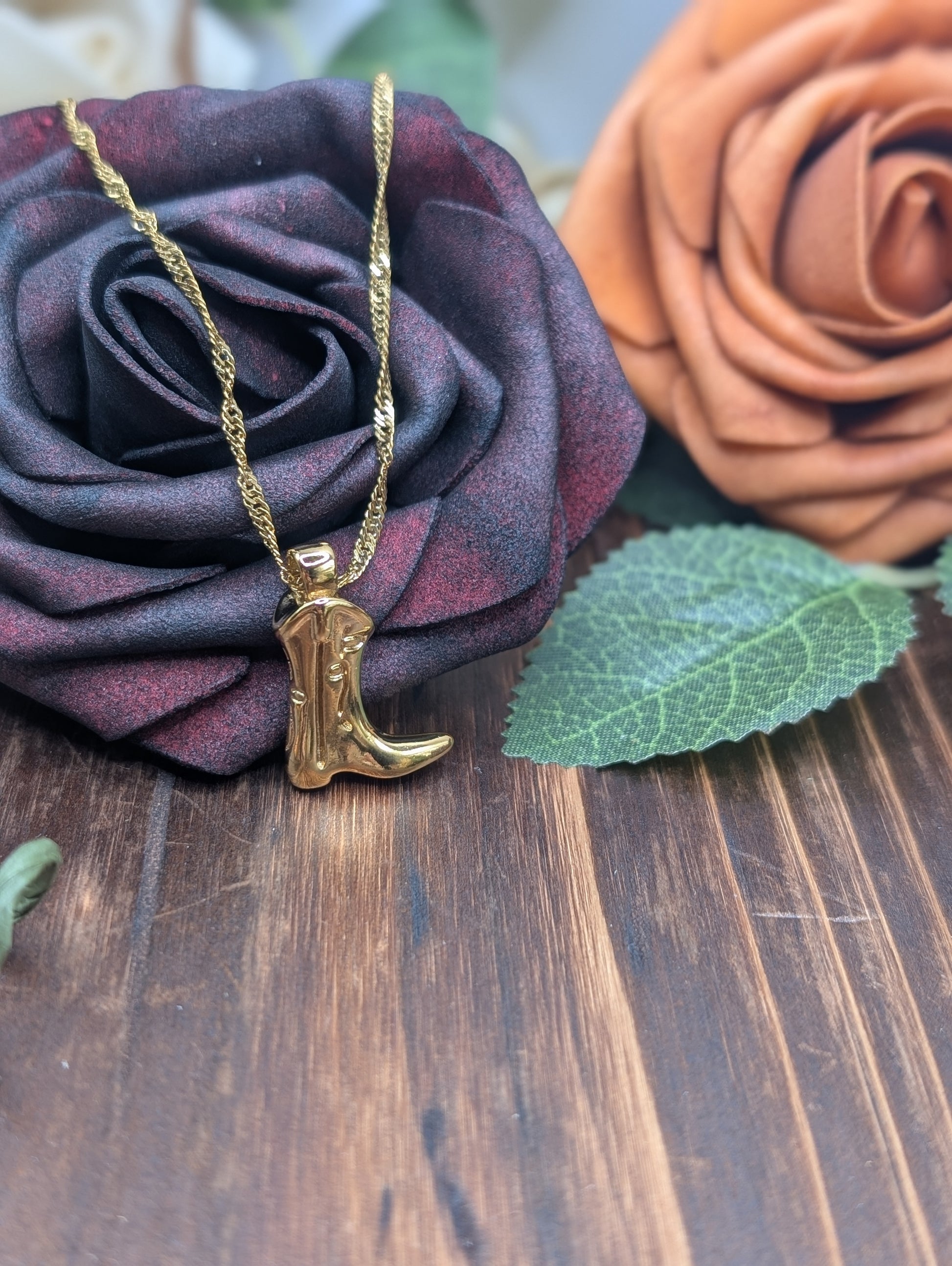 An Icon for every cowboy, embrace your western side with this 18k gold plated Titanium Steel Cowboy boot necklace. Set on twisted gold plated chain, This sweet but subtle pendant will be a great addition to any getup.