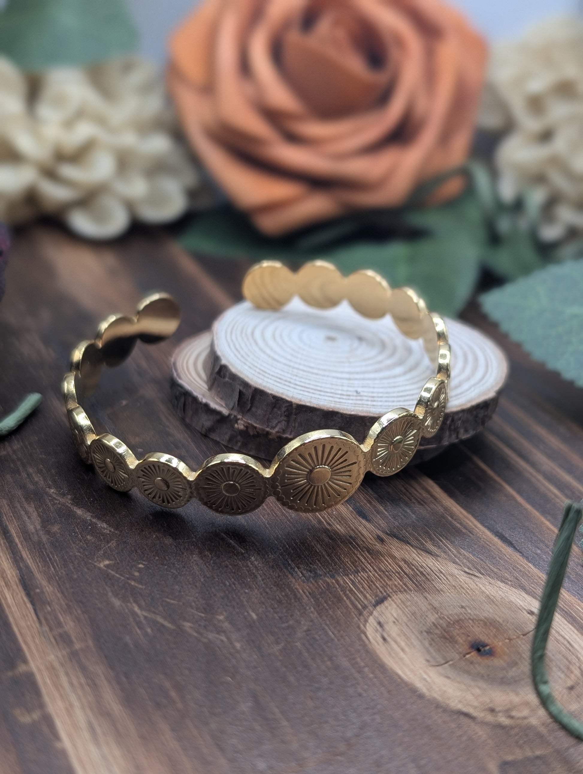Disc 3/4 wrap Stainless Steel Tarnish Free bangle. This 3/4 wrap bangle is part of our Tarnish Free range, that will never lose its shine and work just as hard as you do at being fabulous. Available in both Silver & Gold.