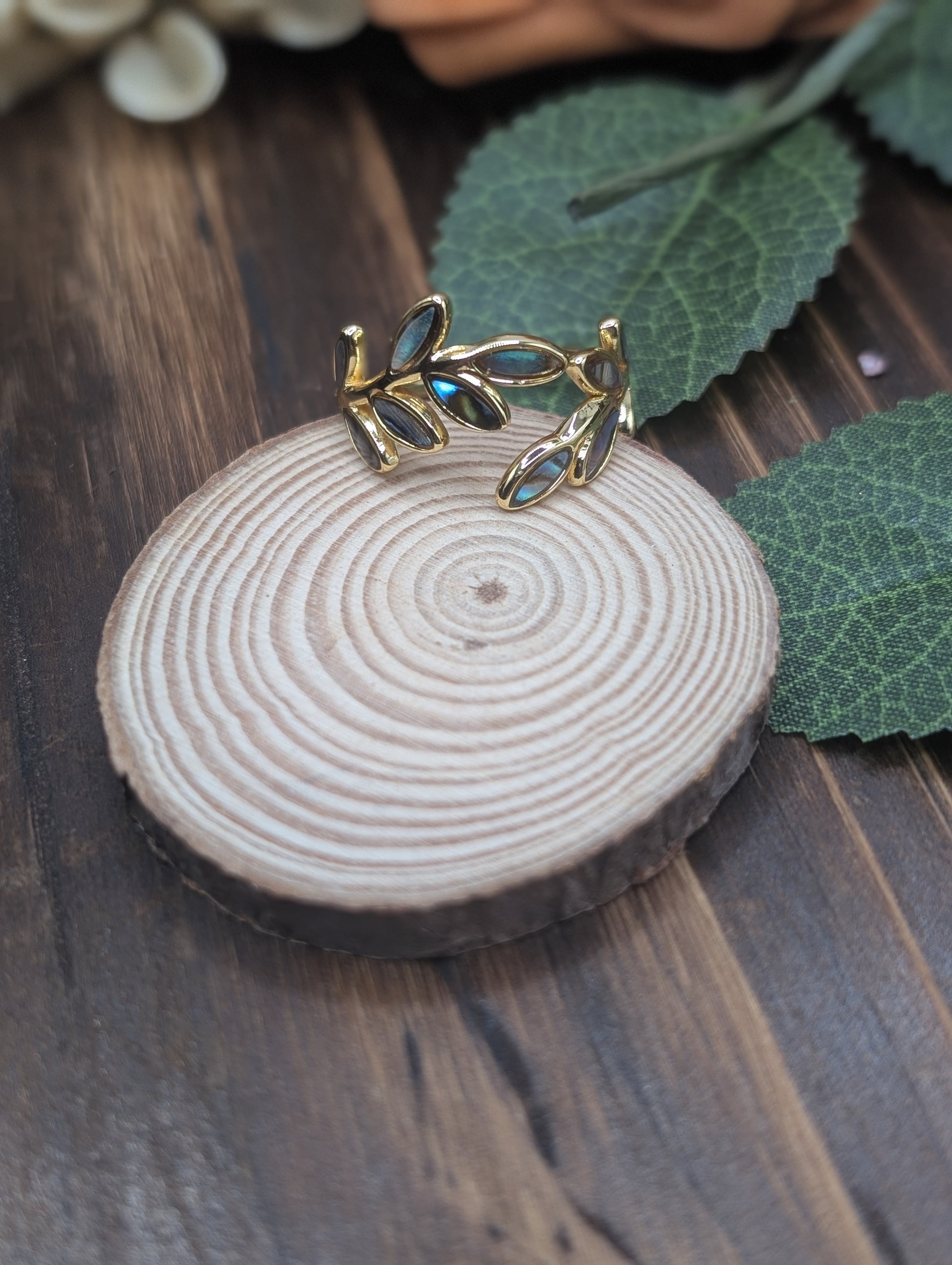 Inlaid with shell this open ring is adjustable and tarnish free.
